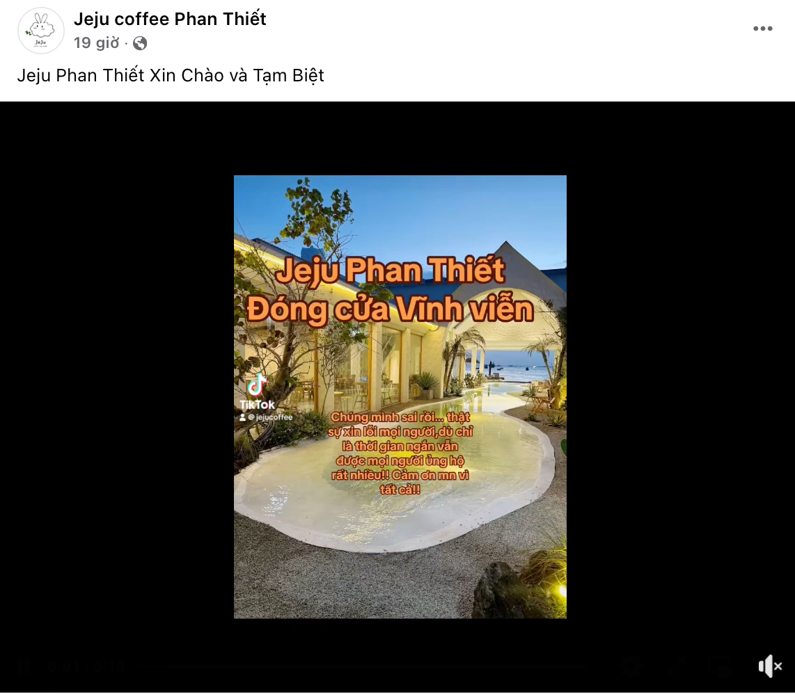 Tưởng chừng sau khi lực lượng chức năng xử lý vi phạm xong, quán sẽ rút kinh nghiệm và tiếp tục hoạt động. Thế nhưng tối 15/10, trên kênh TikTok và fanpage của quán bất ngờ thông báo: "Jeju Phan Thiết đóng cửa vĩnh viễn".