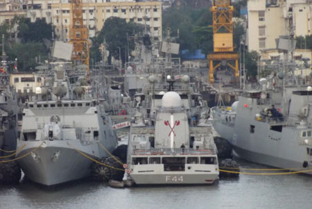 | Các tàu chiến neo đậu tại quân cảng Mumbai ở trong tình trạng cực kì mất an toàn khi phải đậu quá gần nhau, đây cũng là vấn đề được nói đến nhiều sau một số tai nạn của hải quân Ấn Độ. |
