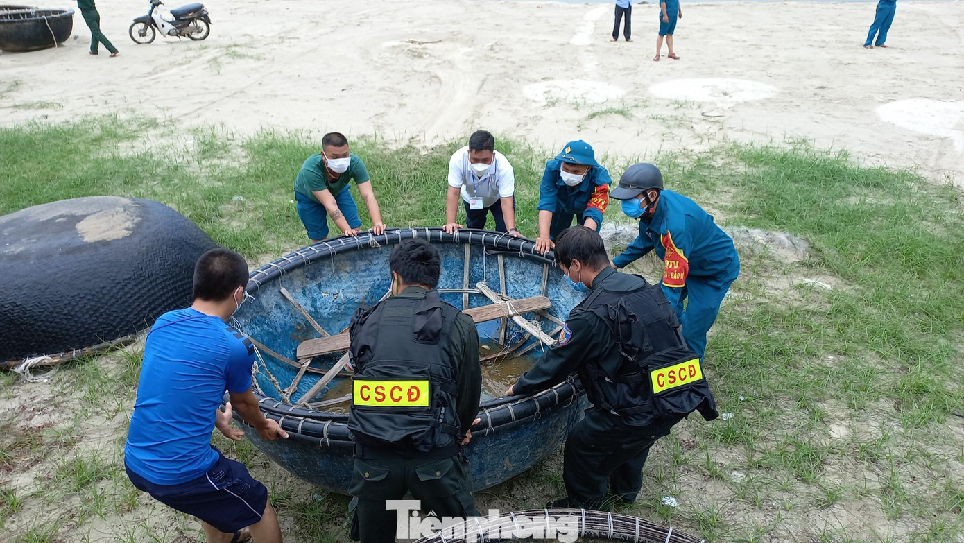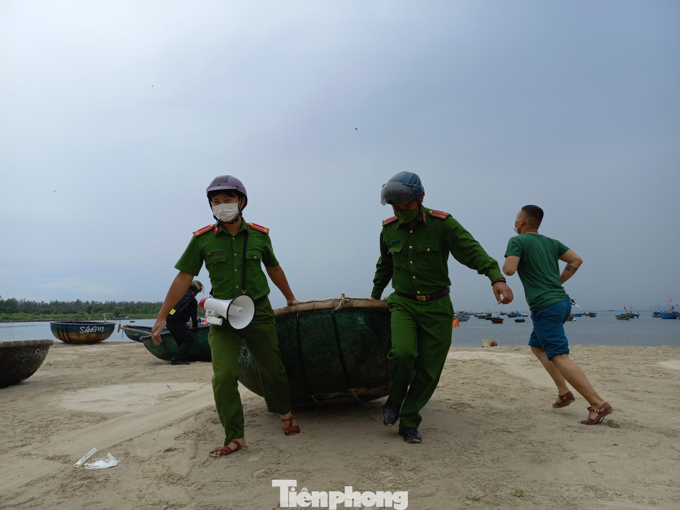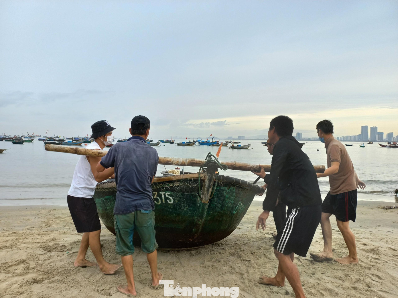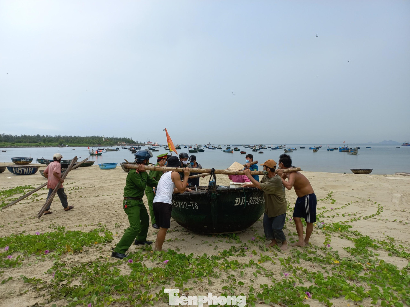 Từ sáng sớm, tại bãi biển Mân Thái, Thọ Quang (quận Sơn Trà) các cán bộ chiến sĩ công an, biên phòng, dân quân tự vệ đã có mặt để giúp người dân kéo tàu, thuyền thúng lên bờ tránh bão.