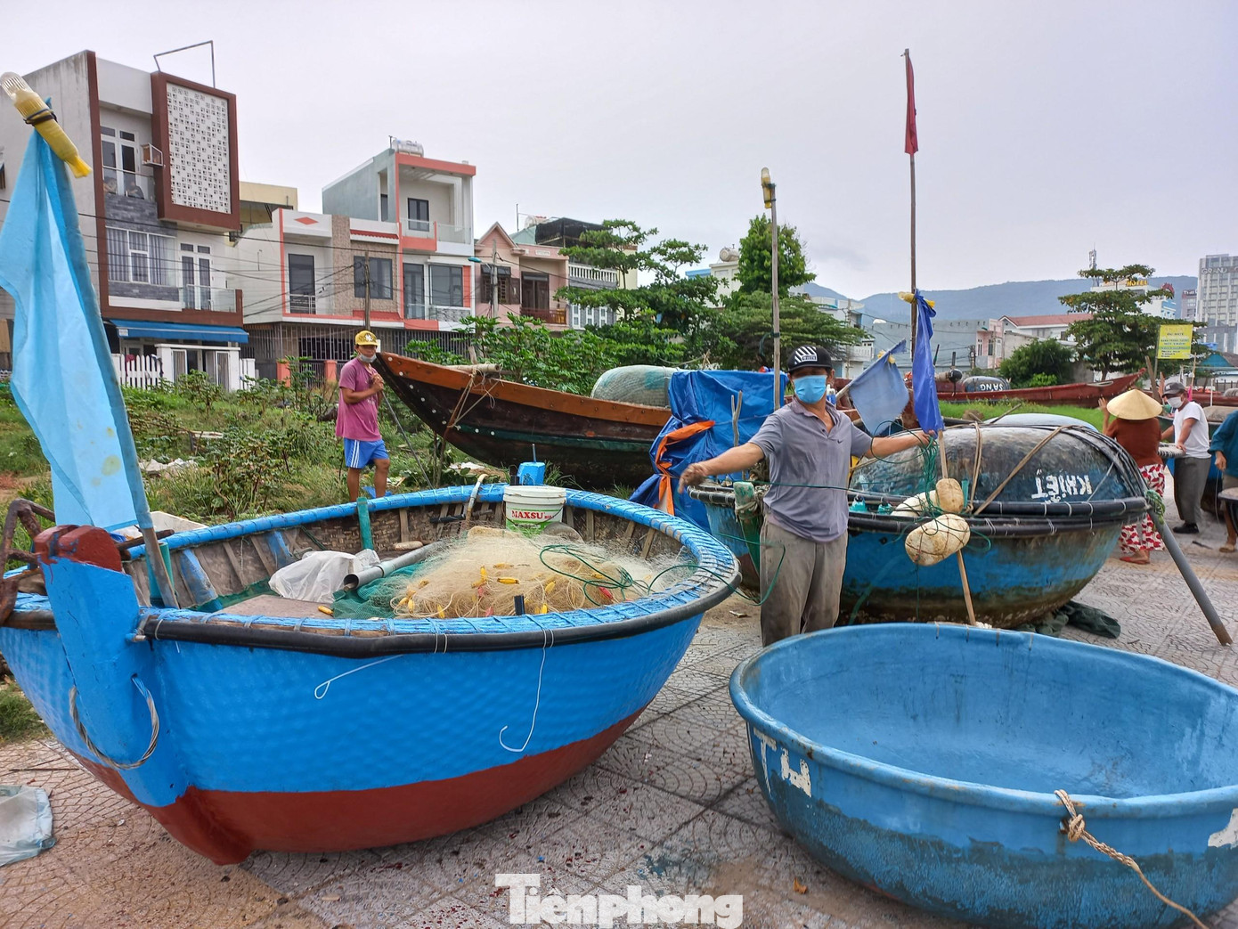 Các thuyền máy lớn đã được yêu cầu cẩu lên bờ, các thuyền thúng nhỏ được di chuyển lên sát đường để neo cột để tránh bão.