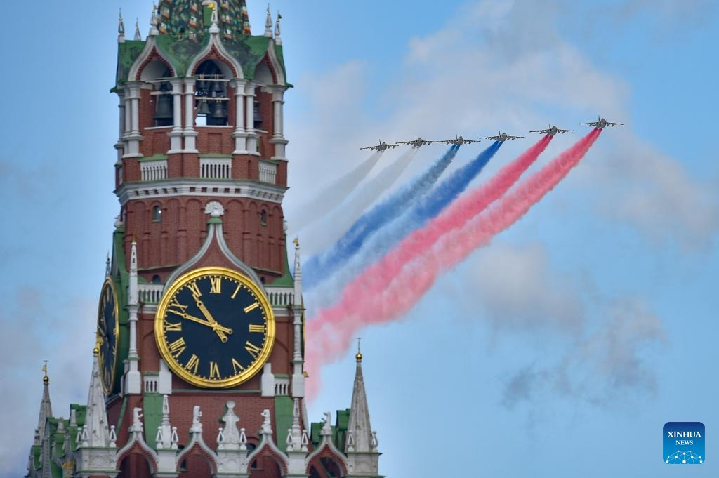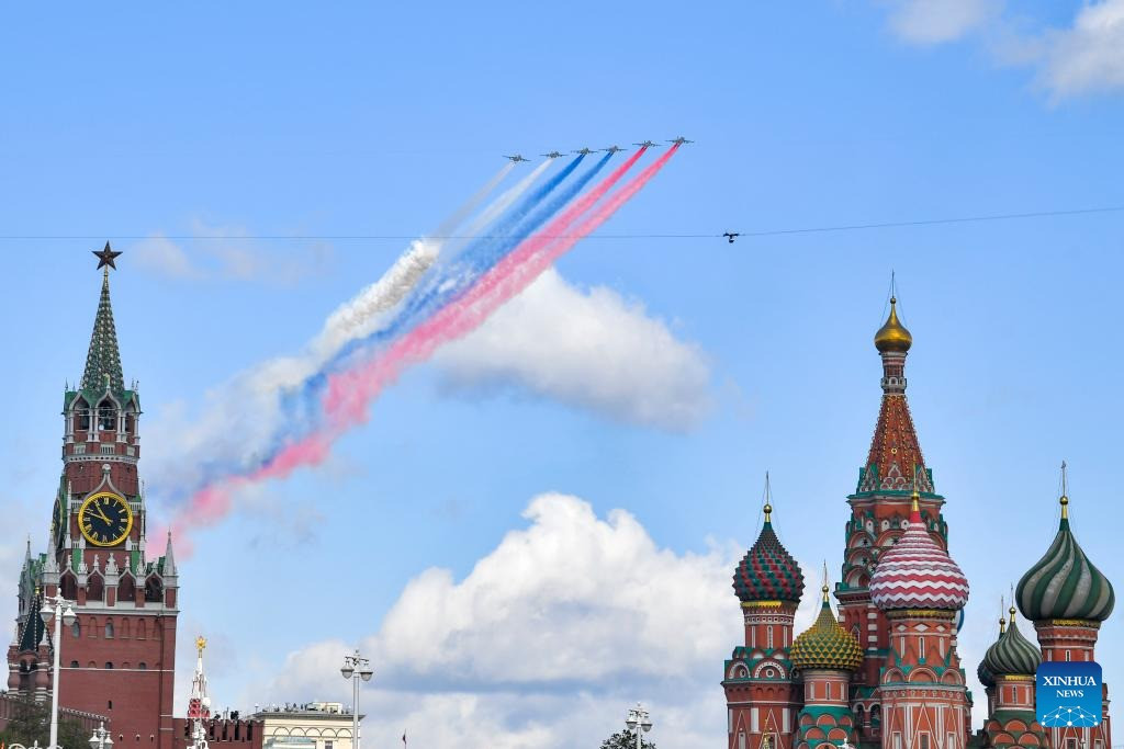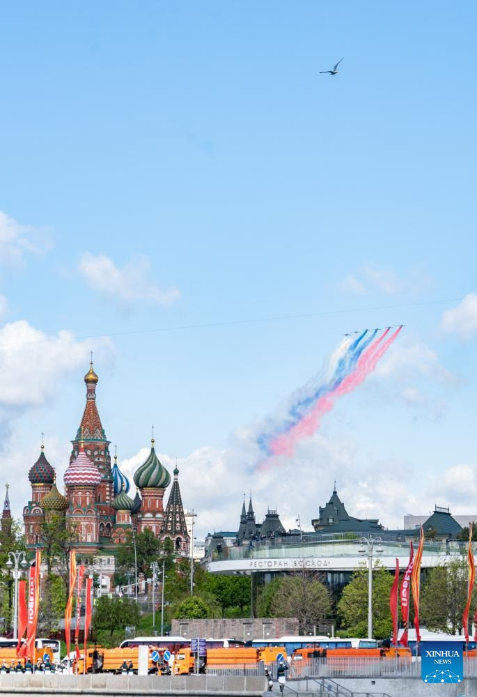 Lễ tổng duyệt kết thúc bằng màn trình diễn của các máy bay chiến đấu với sự tham gia của các phi đội Russkiye Vityazi lái chiến đấu cơ Su-30SM và Strizhi lái máy bay MiG-29, cùng nhóm sáu máy bay tấn công Su-25 phun khói màu quốc kỳ Nga.