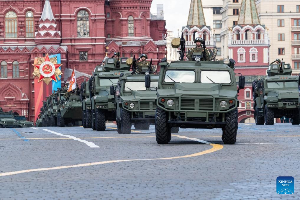 Một chiếc xe tăng T-34 huyền thoại thời Thế chiến II đã dẫn đầu khối xe cơ giới. Theo sau là xe bọc thép Tigr, xe bọc thép chở quân BTR-82A và Bumerang, hệ thống tên lửa chiến thuật Iskander-M, bệ phóng tên lửa đất đối không S-400 và hệ thống tên lửa đạn đạo xuyên lục địa (ICBM) cơ động Yars.