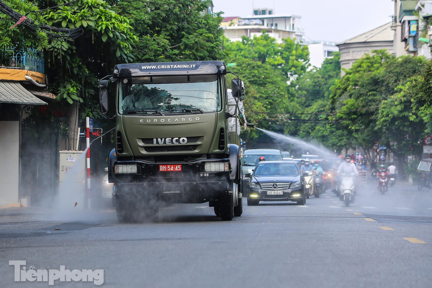 Đúng 8h, các xe quân đội bắt đầu chạy quanh khu vực quận Hoàn Kiếm tiến hành phun khử khuẩn.