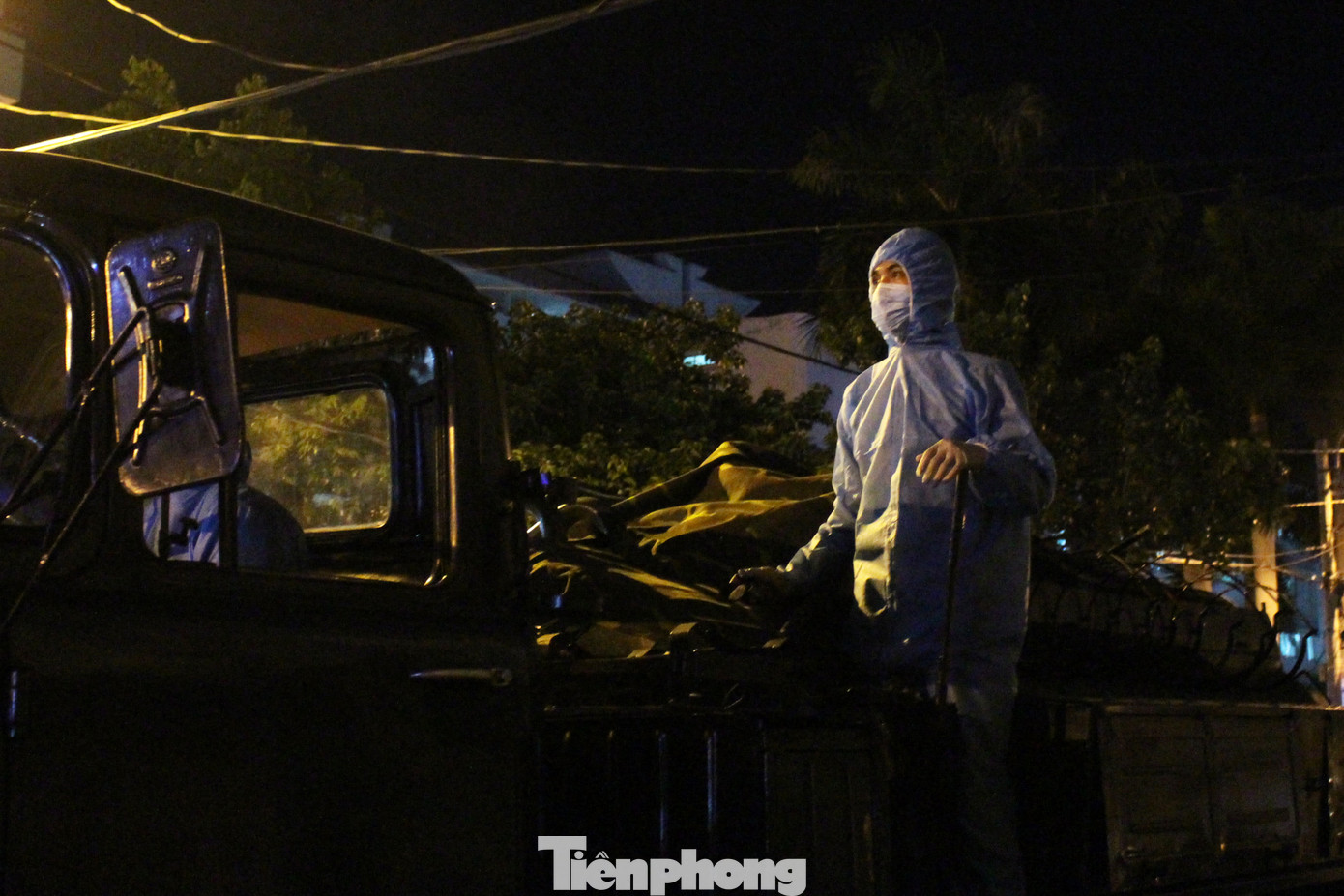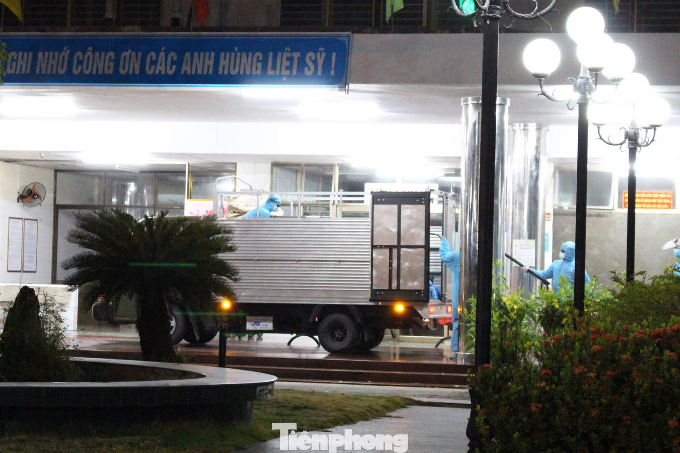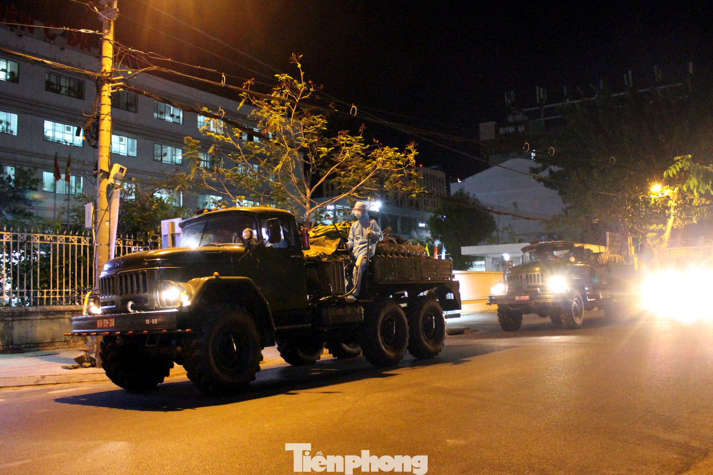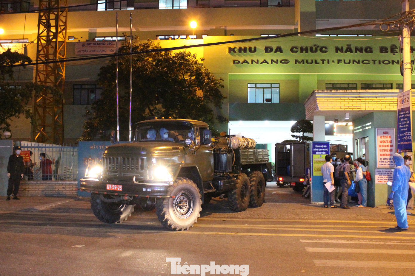 Khoảng 21h45, lực lượng cán bộ chiến sĩ của Tiểu đoàn phòng hóa 78 di chuyển sang khu vực Bệnh viện Đà Nẵng. Bệnh viện này vừa bị phong tỏa từ 13h trưa 26/7, đây là nơi bệnh nhân 418 nhập viện và điều trị trong nhiều ngày. Ảnh: Giang Thanh