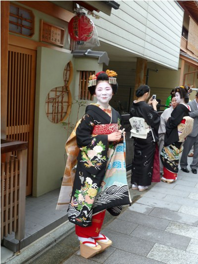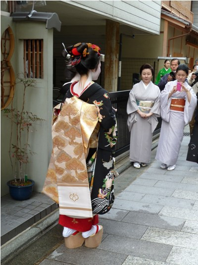 Thỉnh thoảng trên phố lại xuất hiện một vài maiko (geisha tập sự), mặt đã tẩy trang còn tóc vẫn được làm theo kiểu trái đào tách ra, giống như đôi cánh ở hai bên khuôn mặt. Sau thời kỳ thực tập, các cô maiko sẽ trở thành geisha qua buổi lễ được gọi là eriage.