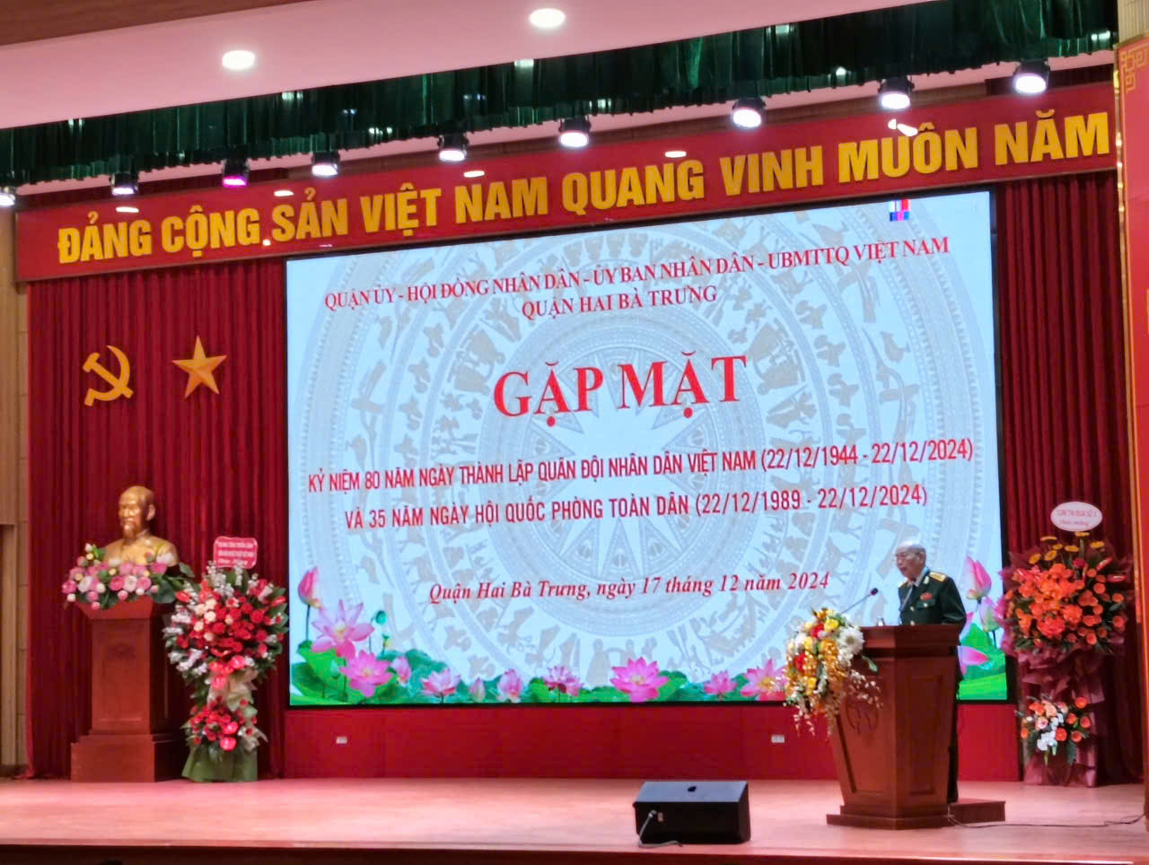 Đến dự có đồng chí Trần Quyết Thắng, Phó Bí thư Thường trực Quận ủy, Đ/c Nguyễn Quang Trung, Phó Bí thư Quận ủy, Chủ tịch UBND quận Hai Bà Trưng cùng đại diện lực lượng vũ trang trên địa bàn quận, gia đình Anh hùng, liệt sĩ, thương binh, bệnh binh, cựu chiến binh, cựu thanh niên xung phong, dân quân, tự vệ, dân công hỏa tuyến - những người con của quận Hai Bà Trưng đã anh dũng chiến đấu, hy sinh, hiến trọn đời mình cho lý tưởng cách mạng của Đảng và dân tộc, cho sự nghiệp xây dựng, chiến đấu và chiến thắng của Quân đội nhân dân Việt Nam anh hùng, cũng như trong sự nghiệp xây dựng và bảo vệ Tổ quốc.