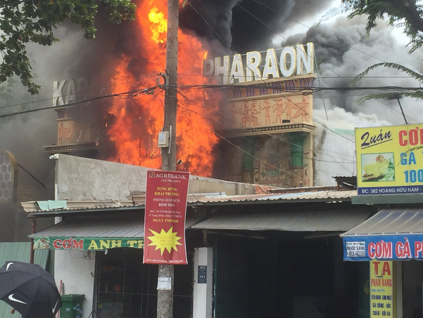 Khoảng 11h45 trưa 7/4, người dân phát hiện khói đen bất ngờ bốc lên dữ dội bên trong quán karaoke Pharaon nằm trên đường Hoàng Hữu Nam, phường Long Thạnh Mỹ, quận 9, TPHCM nên hô hoán.
