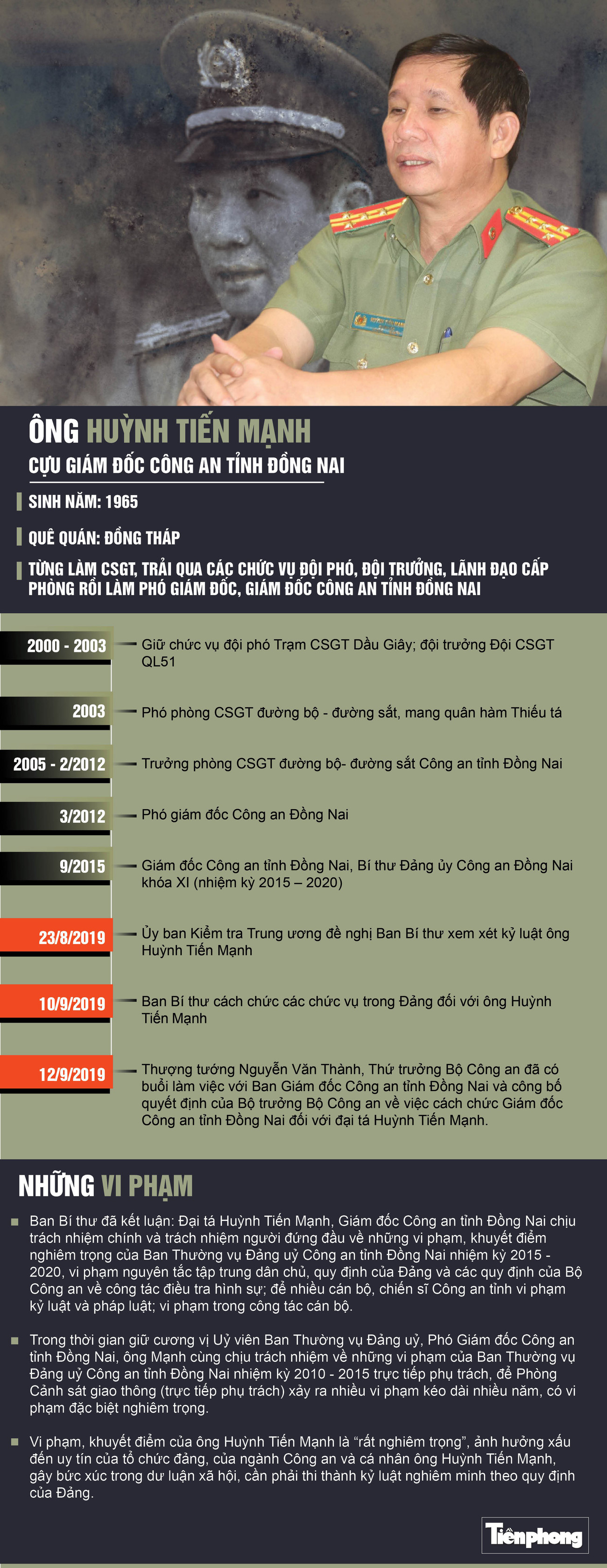 TPO - Đại tá Huỳnh Tiến Mạnh xuất thân là một cán bộ Cảnh sát giao thông (CSGT). Trước khi làm Giám đốc Công an tỉnh, ông Mạnh từng giữ nhiều chức vụ chủ chốt tại Phòng CSGT Đồng Nai. 4 năm sau khi giữ chức Giám đốc Công an tỉnh, ông Mạnh bị cách chức vì nhiều sai phạm.