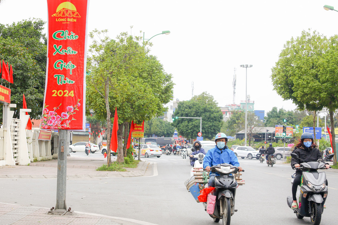 | Đường phố quận Long Biên được trang hoàng chào mừng kỷ niệm 94 năm ngày thành lập Đảng và chào mừng Xuân Giáp Thìn 2024. Ảnh: Duy Phạm. |