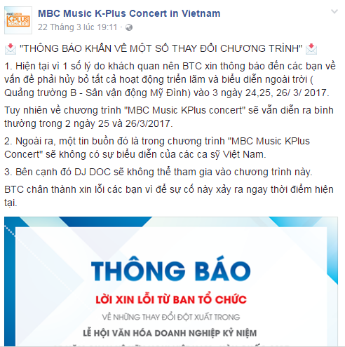 "Hiện tại vì một số lý do khách quan nên BTC xin thông báo đến các bạn về vấn đề phải hủy bỏ tất cả hoạt động triển lãm và biểu diễn ngoài trời (Quảng trường B - Sân vận động Mỹ Đình) vào 3 ngày 24-26/3/2017. Ngoài ra, một tin buồn đó là chương trình MBC Music KPlus Concert sẽ không có sự biểu diễn của các ca sĩ Việt Nam".