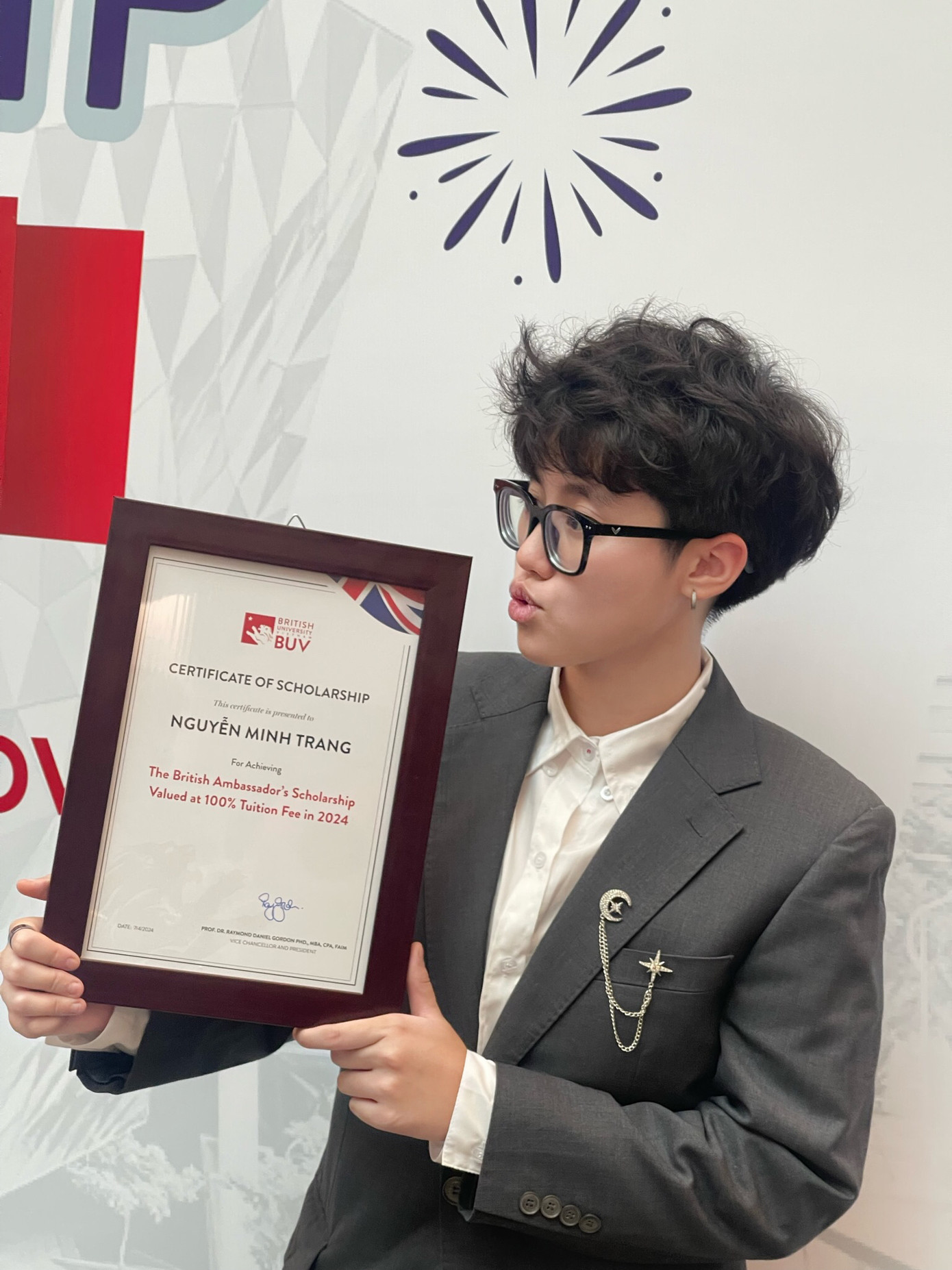 | Nguyễn Minh Trang Quán là quân học bổng Vương quốc Anh, Trường Đại học Anh quốc (BUV). |