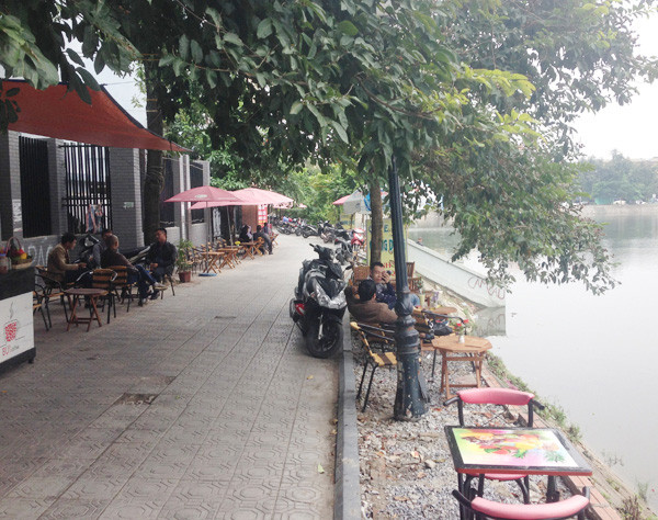 Chị Nguyễn Thu Hằng (sống tại phố Nam Đồng, HN) cho hay, từ khi quán café ven hồ nở rộ cũng là lúc mà khoảng không gian cho người đi bộ bị lấn chiếm. Tối nào đi tập thể dục quanh hồ, chị cũng cảm thấy vất vả phải chen chân qua dãy bàn ghế của các quán café tràn ra đường.