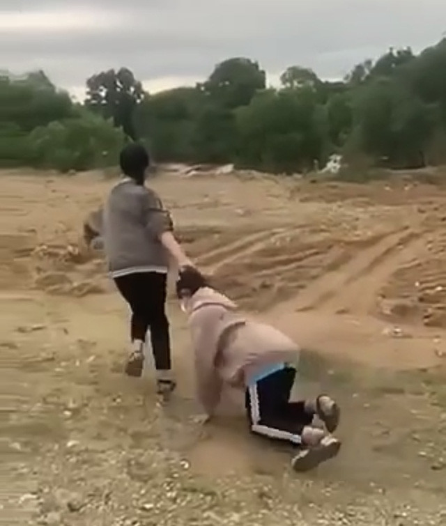 | Sau khi đánh bạn, nữ sinh mang áo xám bắt bạn nữ kia chui vào giữa 2 chân. |
