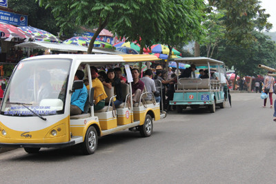 Du khách có thể di chuyển về cổng Đền bằng xe điện được Ban tổ chức bố trí tại nhiều điểm quanh chân núi