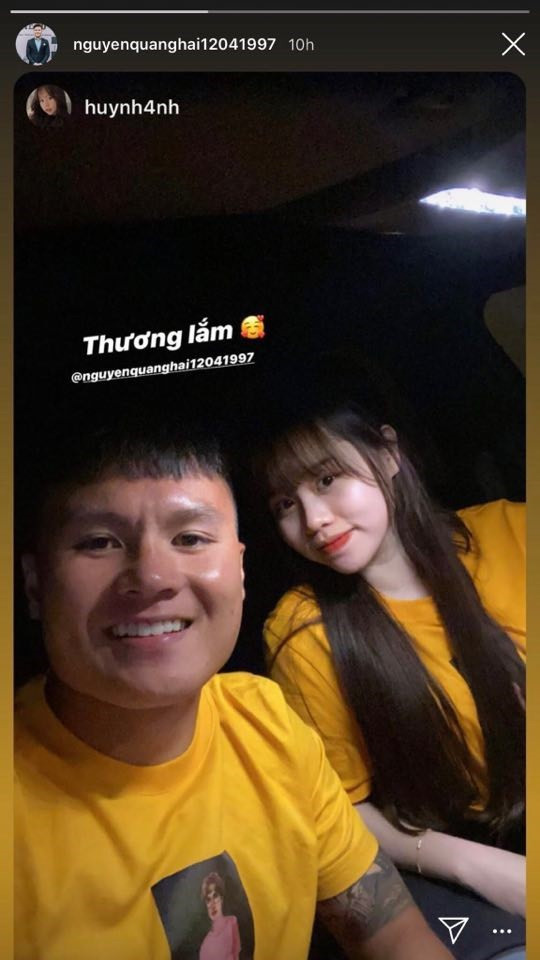 Sau khi cặp đôi Quang Hải - Huỳnh Anh công khai mối quan hệ, cả hai thường xuyên đăng tải những hình ảnh ngọt ngào lên mạng xã hội. Xuất hiện ở vị trí khu giữa khán đài A, Huỳnh Anh nổi bật với chiếc áo phông màu vàng. Người hâm mộ nhanh chóng nhận ra đây chính là chiếc áo đôi với chàng tiền vệ người Hà Nội. Ngay sau trận đấu, cặp đôi cũng đăng story tình cảm bên nhau với chiếc áo này cùng caption: "Thương lắm!".