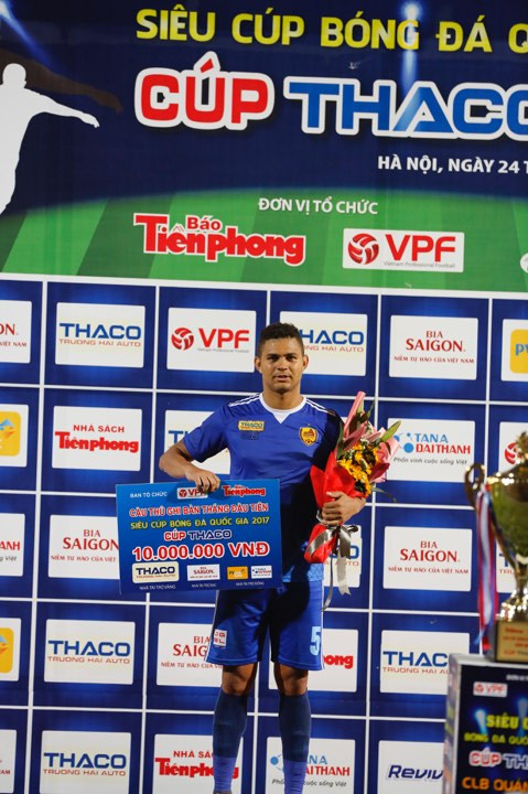Với pha lập công ở phút thứ 42, trung vệ Thiago giúp Quảng Nam giành chiến thắng 1-0 trước SLNA trong trận đại chiến ở sân Hàng Đẫy (Hà Nội) chiều 24/2. Cũng nhờ bàn thắng này, trung vệ người Brazil này nhận giải thưởng "Cầu thủ ghi bàn thắng đầu tiên" ở trận tranh Siêu cúp Quốc gia-cúp THACO 2017 trị giá 10 triệu đồng.