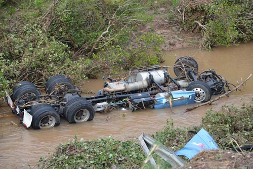 Ghi nhận của PV tại hiện trường, hàng chục mét rào chắn an toàn bên đường đã bị phá nát. Đầu kéo, rơ-moóc và thùng hàng biến dạng nằm dưới vực sâu, một phần bị chìm dưới nước.
