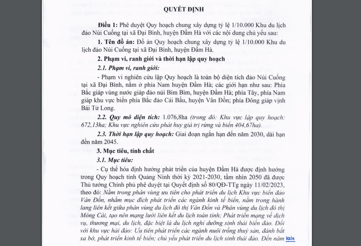 Theo đó, phạm vi nghiên cứu lập quy hoạch gồm toàn bộ diện tích đảo Núi Cuống với một mặt giáp vịnh Bái Tử Long, hai mặt giáp biển phía Bắc đảo Cái Bầu (huyện Vân Đồn). Thời hạn lập quy hoạch dự án này đến năm 2030 và dài hạn đến 2045.