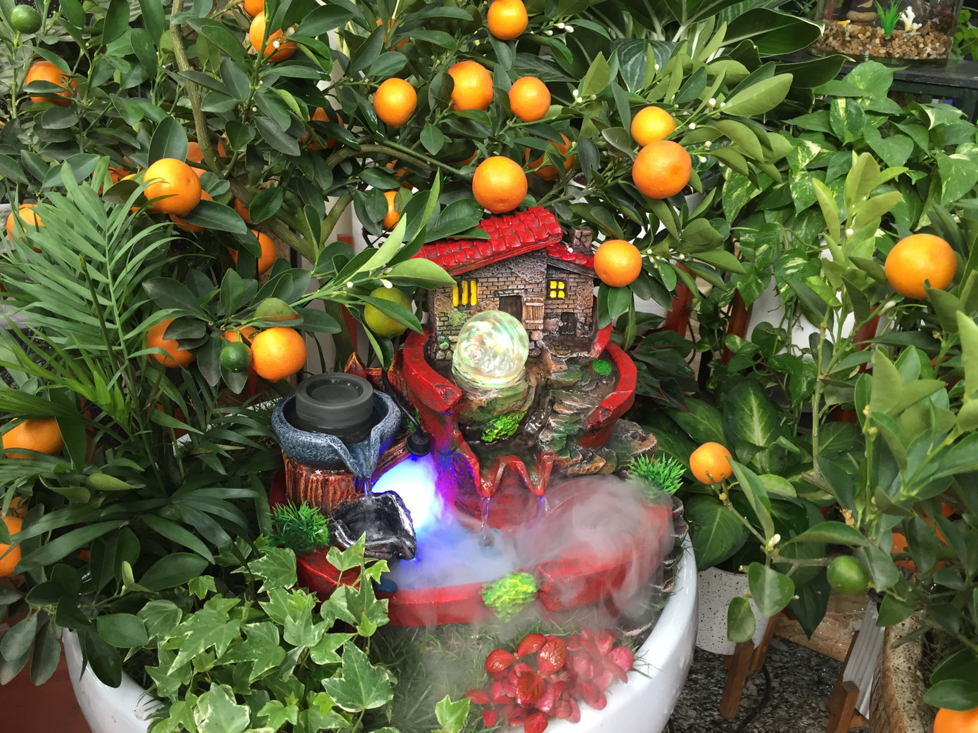 Để tạo các cây thế này, quất phải uốn, tạo dáng ngay từ khi cây còn non, tạo khoảng trống dưới gốc để đặt hòn non bộ. Cách chăm sóc không khác quất cảnh thông thường. Để duy trì thác nước chảy, phải đặt cố định một bát nước dưới chậu, duy trì cắm điện.