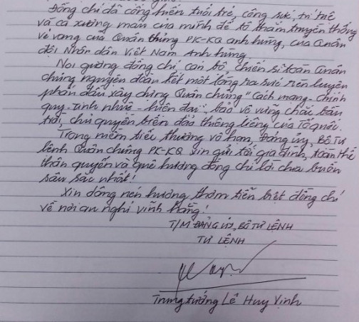 Cuốn sổ tang ghi lại những dòng tâm trạng ngập tràn niềm tiếc thương. Thay mặt Đảng ủy, Bộ tư lệnh và cán bộ chiến sĩ Quân chủng PK-KQ, Trung tướng, Tư lệnh Lê Huy Vịnh viết: “Đồng chí là tấm gương sáng về tinh thần đoàn kết, khắc phục khó khăn quyết tâm hoàn thành xuất sắc mọi nhiệm vụ được giao. Đồng chí đã cống hiến tuổi trẻ, công sức, trí tuệ và cả xương máu của mình để tô thắm truyền thống vẻ vang của Quân chủng PK-KQ anh hùng, của Quân đội nhân dân Việt Nam anh hùng. Noi gương đồng chí, cán bộ, chiến sĩ toàn Quân chủng nguyện đoàn kết một lòng ra sức rèng luyện phấn đấu, xây dựng Quân chủng “cách mạng – chính quy – tinh nhuệ - hiện đại”, bảo vệ vững chắc bầu trời chủ quyền biển đảo thiêng liêng của Tổ Quốc”.