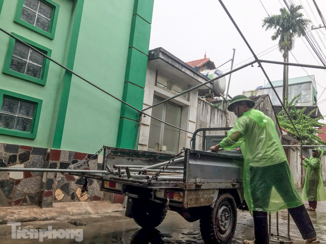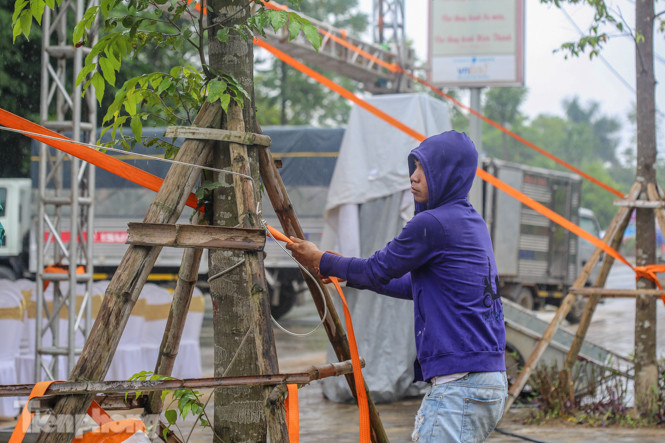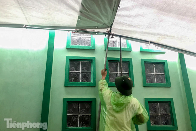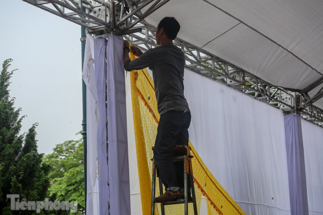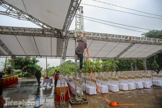 Tại nhà riêng, một nhóm công nhân đang gấp rút căng bạt.
