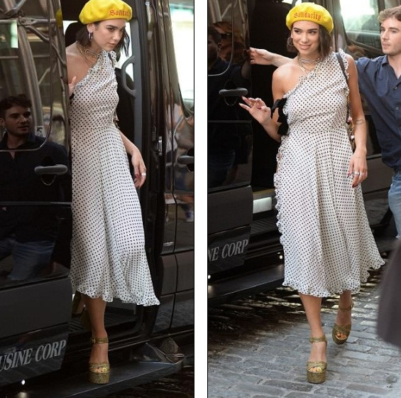 Nữ ca sĩ mới nổi của làng nhạc Anh quốc diện váy chấm bi lệch vai duyên dáng khi ra phố vào hôm qua.