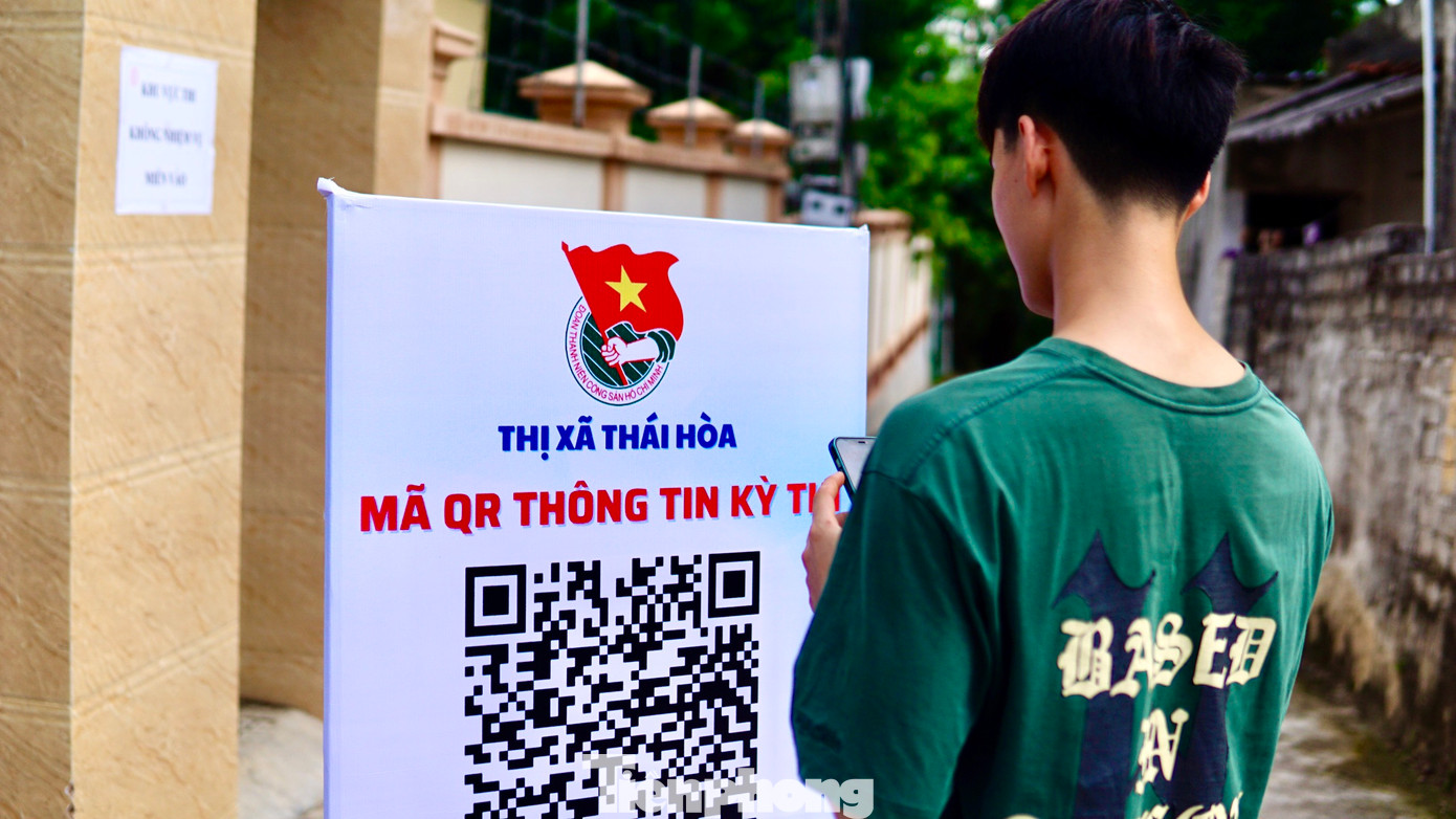 | Khác với mọi năm, năm nay, tại điểm thi trường THPT Thái Hòa (thị xã Thái Hòa, Nghệ An), Ban Thường vụ Thị đoàn Thái Hòa đã bố trí bảng chứa mã QR thông tin kỳ thi để các bạn thí sinh có thể tra cứu số báo danh, phòng thi, các nội quy, quy chế trong quá trình tham dự Kỳ thi THPT Quốc gia năm 2023. |