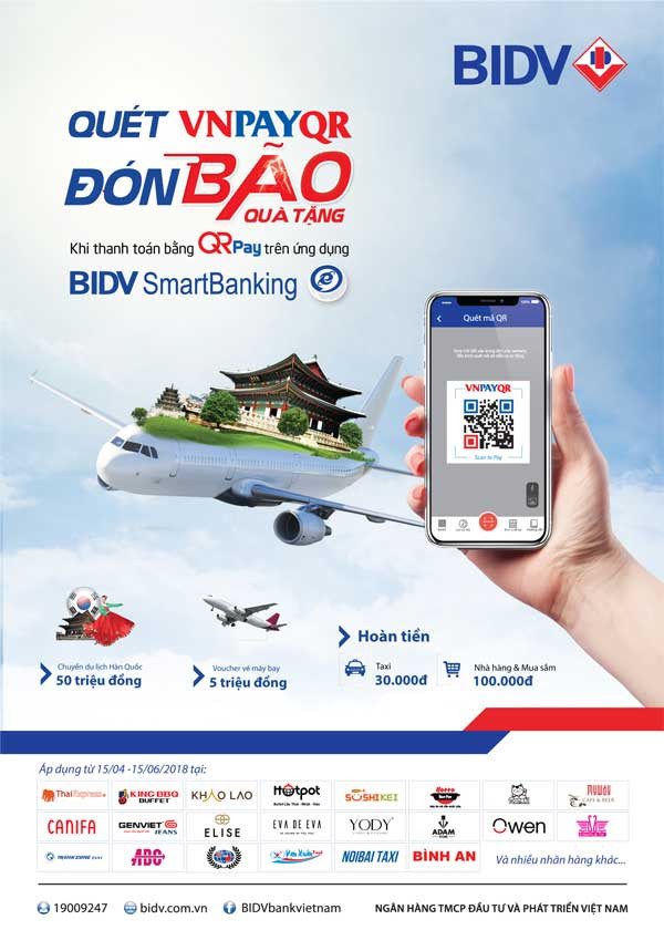 Từ ngày 15/04/2018 đến hết ngày 15/06/2018, khi thanh toán qua tính năng QR Pay trên ứng dụng BIDV SmartBanking quý khách có tới 3 cơ hội trúng thưởng hấp dẫn. Theo đó, đối với hình thức hoàn tiền trực tiếp, khách hàng sẽ được hoàn 100.000 đồng cho mỗi giao dịch có giá trị từ 500.000đ trở lên (tối đa 5 lần) khi thanh toán bằng tính năng QR Pay thành công trên BIDV SmartBanking tại các nhà hàng ThaiExpress, KingBBQ, Tasaki BBQ, Sushi Kei, Hải sản Biển Đông, HOTTO, Hotpot Story hoặc hệ thống thời trang Canifa, Eva de Eva, Elise, GenViet, Adam Store... Đối với các điểm áp dụng khuyến mại ngành hàng taxi & xe khách (như Taxi Thành Công, ABC, Vina Sao, Nội Bài, xe khách Bình An…) khách hàng được hoàn trực tiếp 30.000 đồng cho mỗi giao dịch có giá trị từ 60.000 VNĐ trở lên, tối đa 10 lần trong toàn thời gian diễn ra chương trình.