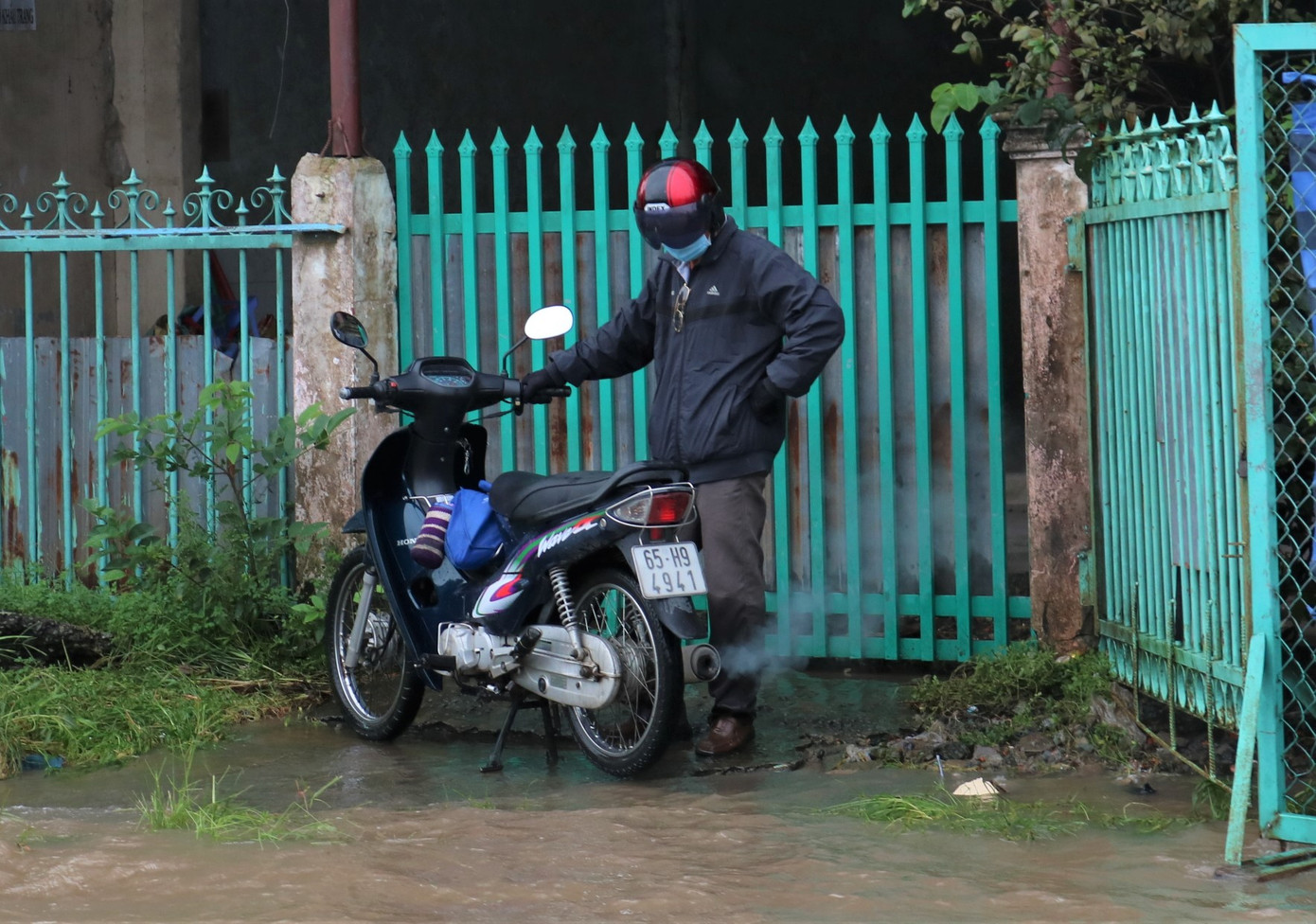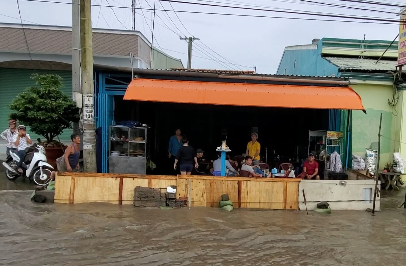 Chiến sĩ công an hỗ trợ đưa xe bị chết máy của chị Hà qua đoạn ngập - Ảnh: Kim Hà. Theo thông tin dự báo của Đài khí tượng thủy văn tỉnh Vĩnh Long, tính đến 7h ngày 19/10, mực nước cao nhất trên các sông, rạch trên địa bàn tỉnh đang lên nhanh theo triều. Cụ thể tại Mỹ Thuận cao hơn mức báo động 3 là 0,25m. So với đỉnh kì triều rằm tháng 8 (âm lịch) cao hơn 0,48m; hầu hết các trạm nội đồng đạt mức 1,7 – 1,93m. Mỗi ngày, đỉnh triều sẽ lệch nhau 1 giờ, tập trung vào các giờ cao điểm trong buổi sáng và chiều.