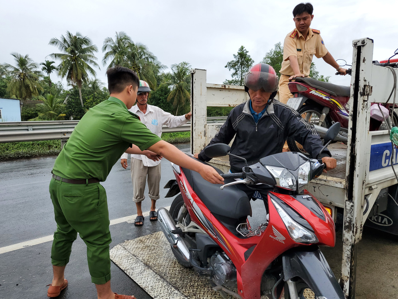 Thượng úy Huỳnh Công Nhân - Bí thư đoàn thanh niên Công an thị xã Bình Minh (bên phải) hỗ trợ đưa phương tiện của người dân lên xe chuyên dụng để đi qua đoạn ngập - Ảnh: Kim Hà. “So với mực nước năm rồi thì năm nay cao hơn năm rồi cũng khá nhiều. Các phương tiện xe gắn máy, kể cả xe ô tô đi qua đoạn đường này đều bị tắt máy. Để đảm bảo việc cứu hộ cho phương tiện giao thông, Đoàn thanh niên Công an thị xã Bình Minh đã huy động một số đồng chí phối hợp cùng đội CSGT và Đoàn thanh niên xã Thuận An để hỗ trợ người dân qua trong đợt triều cường năm nay” – Thượng úy Nhân chia sẻ.