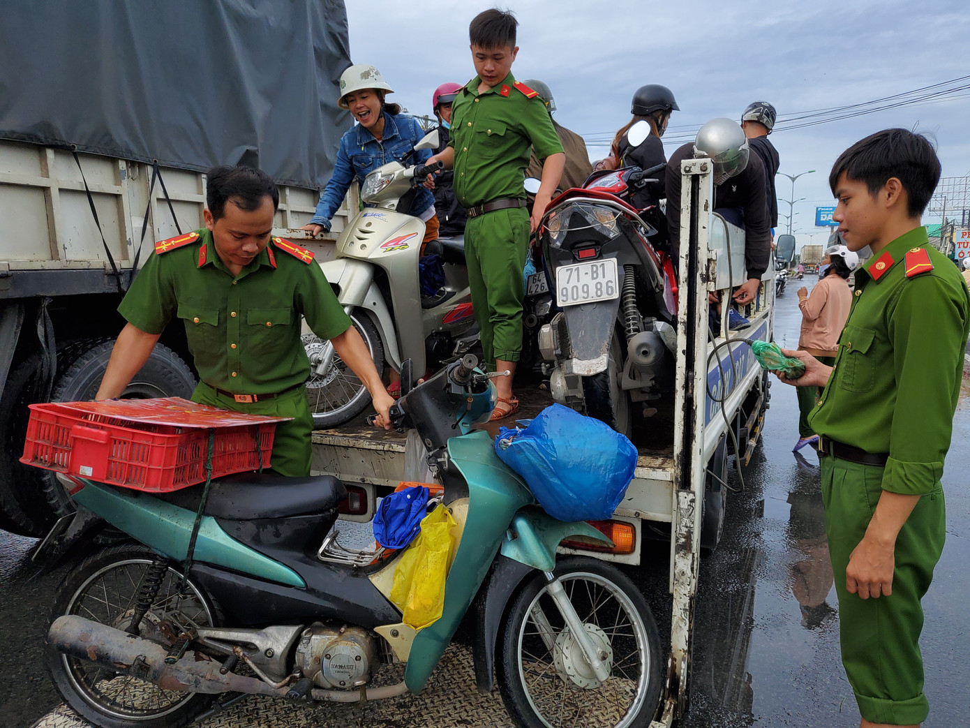 Đoàn thanh niên Công an thị xã Bình Minh đã huy động lực lượng, dùng xe tải chuyên dụng đưa phương tiện của người dân "vượt đường" - Ảnh: Kim Hà.