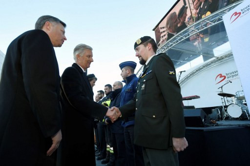 Giám đốc điều hành sân bay Brussels, ông Arnaud Feist, Quốc vương Philippe và Hoàng hậu Mathilde tham dự lễ tưởng niệm tại sân bay Brussels