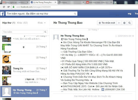 Được con cháu lập cho tài khoản Facebook để giao lưu với bạn cũ, bà P. thích lắm. Được hai tuần, Facebook của bà xuất hiện một tin nhắn có nội dung: "Chúc mừng tài khoản của bà đã trúng giải nhất từ Chương trình Tri ân khách hàng Facebook. Giải thưởng gồm 1 xe máy Liberty 150 trị giá 65 triệu đồng; 1 phiếu quà tặng trị giá 100 triệu đồng và 1 phiếu đổ xăng miễn phí trị giá 5 triệu đồng. Tin nhắn này còn kèm theo mã số may mắn, khiến bà P. lại càng tin tưởng hơn về vận may của mình.