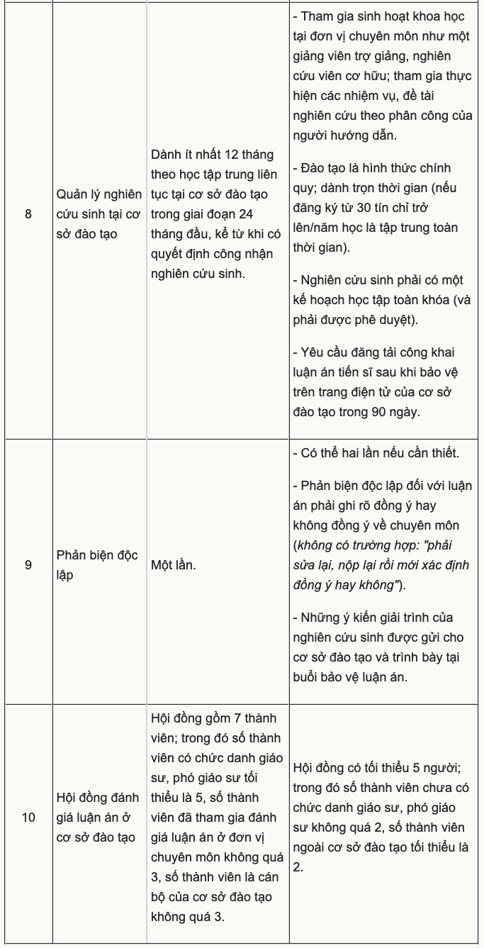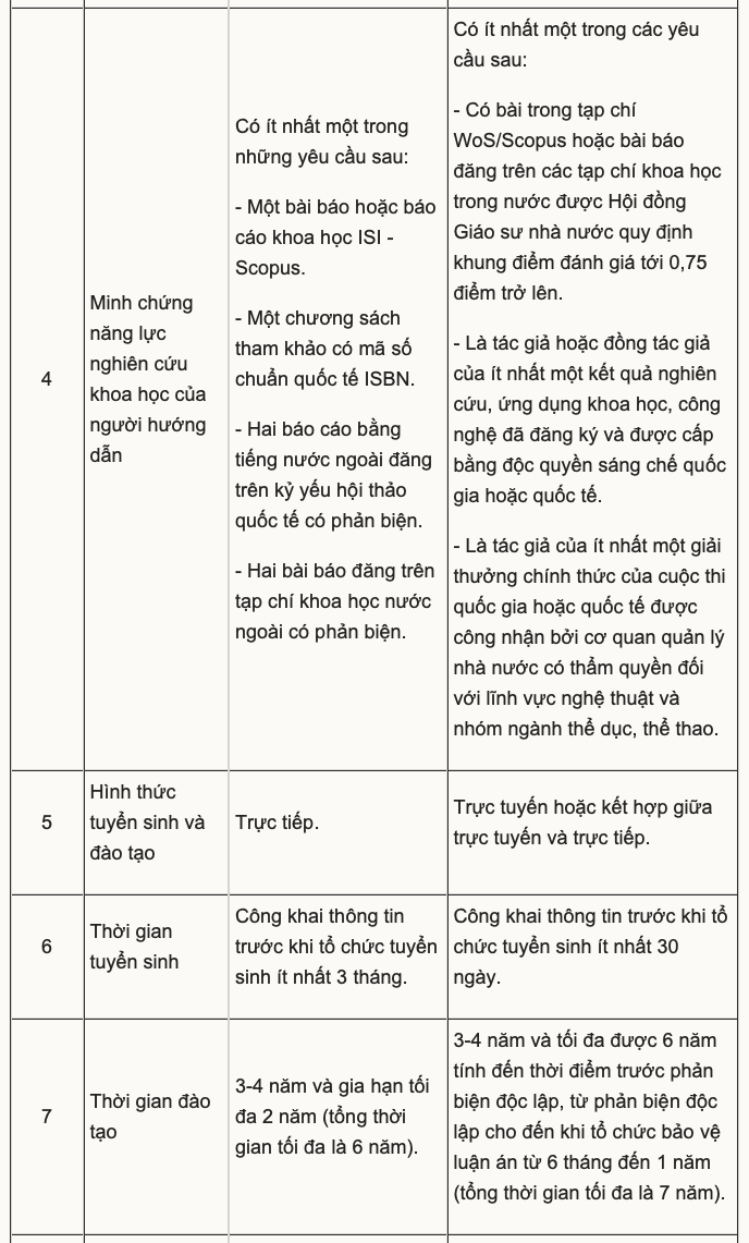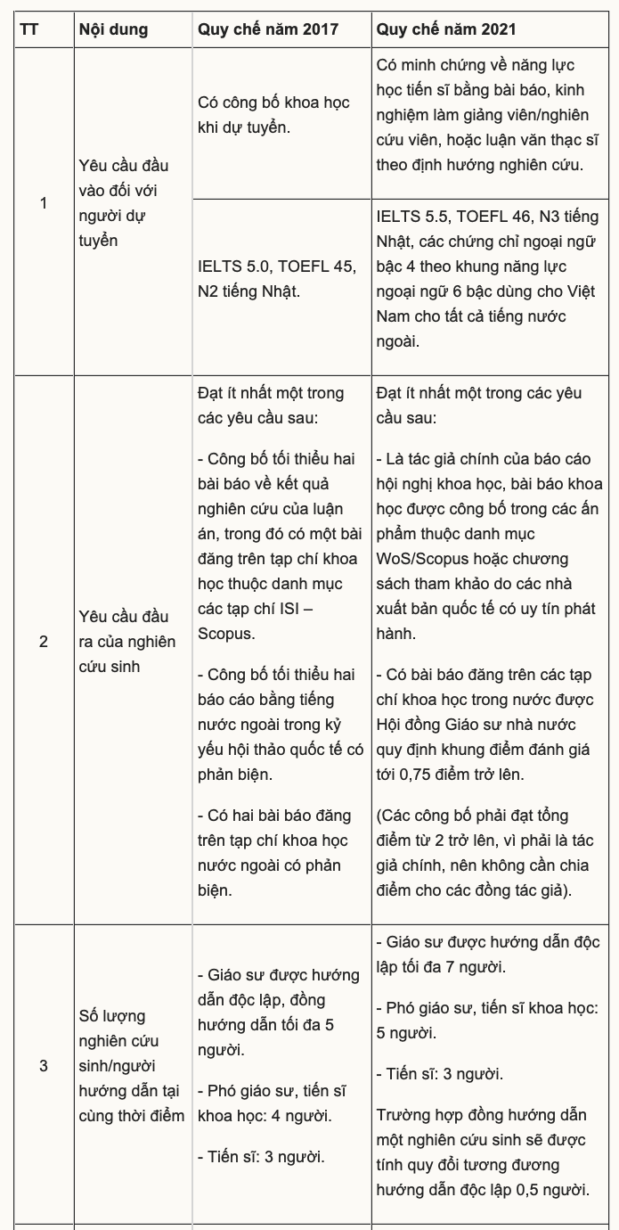 Một số điểm mới được nhiều người quan tâm, như cho phép ứng viên có chứng chỉ ngoại ngữ bậc 4 theo khung năng lực ngoại ngữ 6 bậc dùng cho Việt Nam được dự tuyển, thay vì chỉ chấp nhận chứng chỉ quốc tế như IELTS, TOEFL; chấp nhận công bố tại các tạp chí trong nước có chất lượng tốt đối với người hướng dẫn và nghiên cứu sinh.