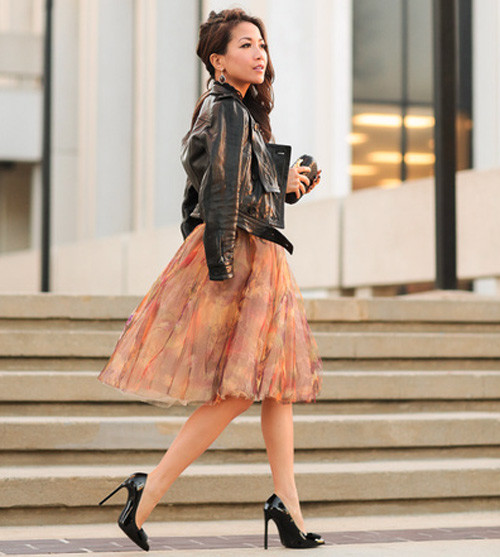 Wendy trị đôi chân ngắn bằng váy voan bồng bềnh kết hợp với áo khoác jacket da lửng sành điệu để cân bằng tỷ lệ cơ thể