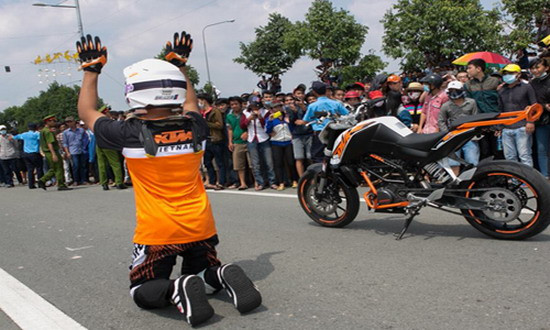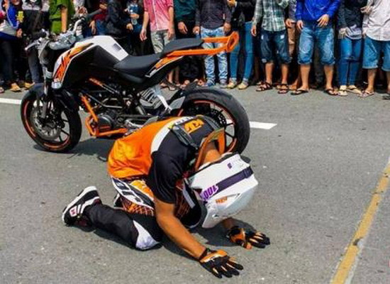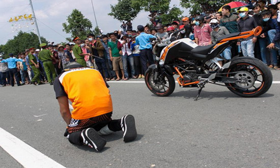 Hành động quỳ lạy của VĐV Malaysia diễn ra ngay tại cuộc đua mô tô phân khối lớn trên đường thẳng 400m do Liên đoàn xe đạp - mô tô thể thao Việt Nam phối hợp với tỉnh Bình Dương tổ chức.