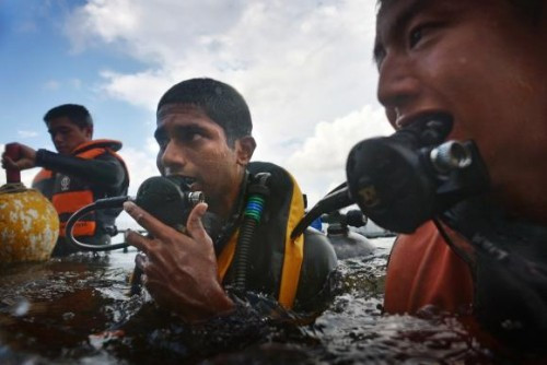 Hạ sĩ quan S. Rajendren (trái) đang hướng dẫn học viên Anson Chew, 21 tuổi, kỹ năng lấy kính lặn bẳng răng. Đây là một trong số các bài tập dành cho học viên. Chỉ những người thích hợp nhất mới có cơ hội phục vụ NDU.