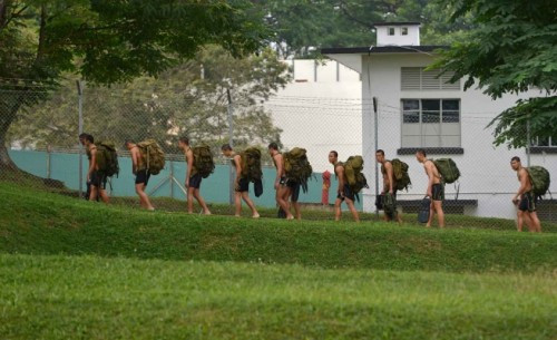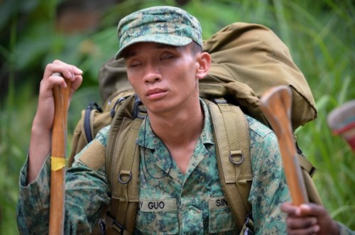 Kevin Liew, 21 tuổi, vừa di chuyển vừa dùng hết sức để nâng hai chân của học viên phía trước. Nhiều học viên không thể vượt qua quá trình đào tạo nghiêm ngặt về thể chất và tinh thần.