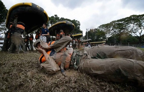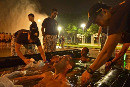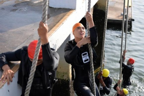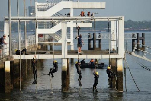 Học viên Jared Lim, 21 tuổi, đang leo lên tháp bằng một sợi dây thừng. Nhiệm vụ của NDU là thực hiện các hoạt động cứu hộ, phá hủy vật liệu nổ dưới nước, chống xâm nhập đường biển, chống khủng bố, giải cứu con tin, đặc biệt là các vụ bắt cóc trên biển, cũng như các hoạt động chiến đấu.