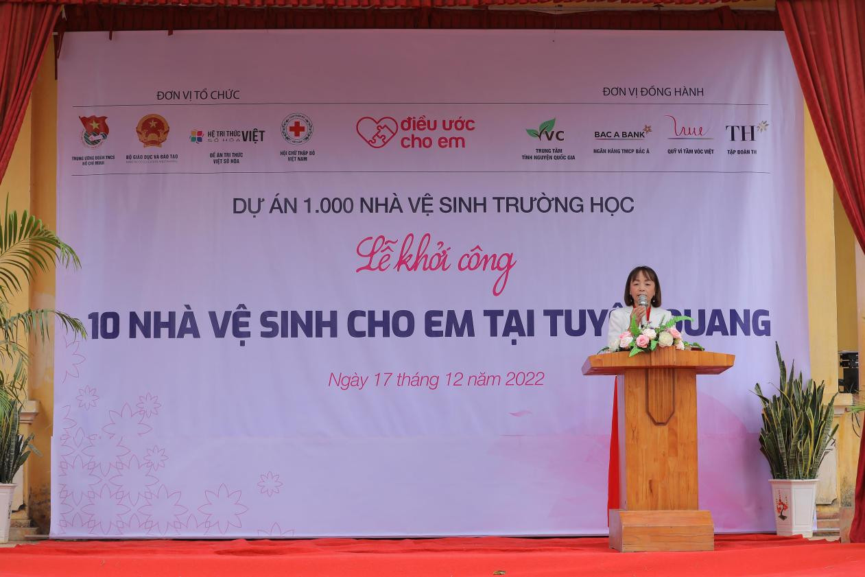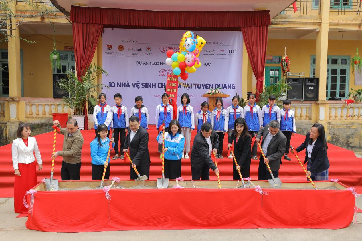 “Rất xúc động khi mong mỏi của thầy trò nhà trường đã thành sự thật. Chúng tôi cam kết sẽ tuyên truyền, hướng dẫn học sinh để các em có ý thức giữ gìn nhà vệ sinh sạch sẽ, bảo đảm hiệu quả sử dụng lâu dài.” - cô Khổng Thị Thái, Hiệu trưởng trường Phổ thông DTBT THCS Hùng Đức, đại diện 10 trường tại Tuyên Quang chia sẻ tại lễ khởi công.