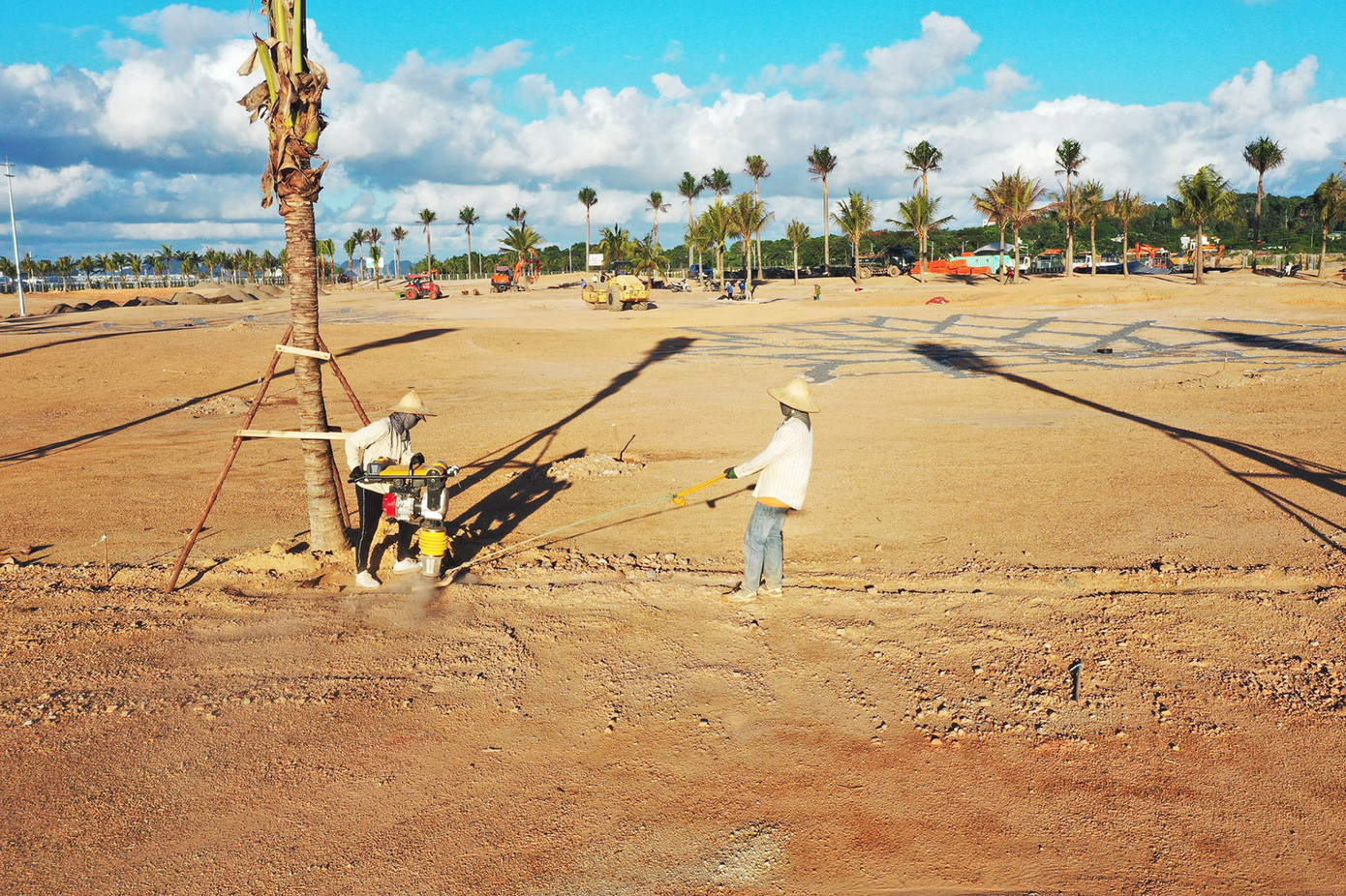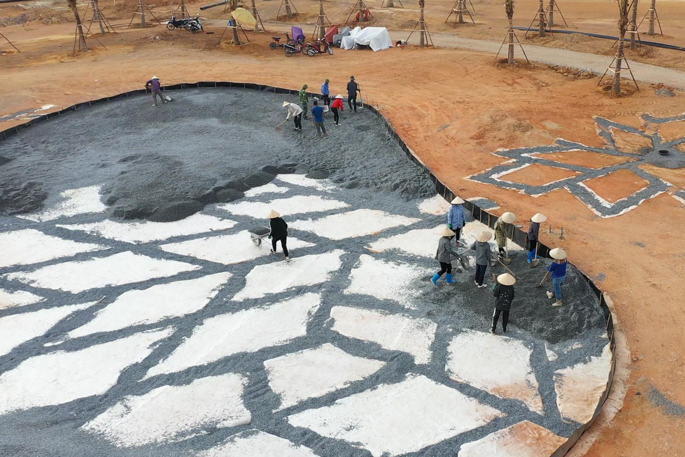 Nhà thầu thi công đang thực hiện gia cố nền sân.