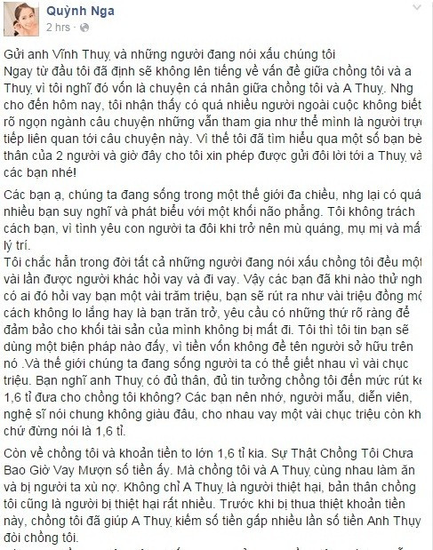Sau một thời gian giữ im lặng trước vụ việc ông xã bị Vĩnh Thụy tố quỵt nợ 1,6 tỷ đồng, tối 27/12, nữ ca sĩ Quỳnh Nga quyết định lên tiếng để bảo vệ danh dự cho Doãn Tuấn trên trang cá nhân. Theo đó, cô cho biết mình không muốn nhắc tới vụ rắc rối này vì đó vốn là chuyện cá nhân giữa chồng cô và người mẫu Vĩnh Thụy. Nhưng do có nhiều người không biết rõ ngọn nguồn sự việc nhưng vẫn tham gia đơm đặt câu chuyện nên buộc lòng cô phải lên tiếng.