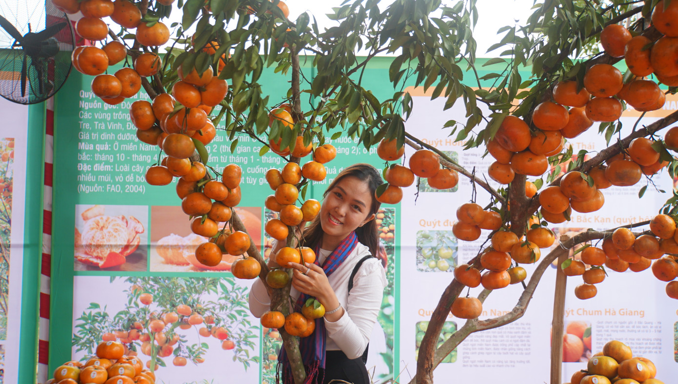| Bạn trẻ chụp ảnh với quýt hồng. Ảnh: Hòa Hội |