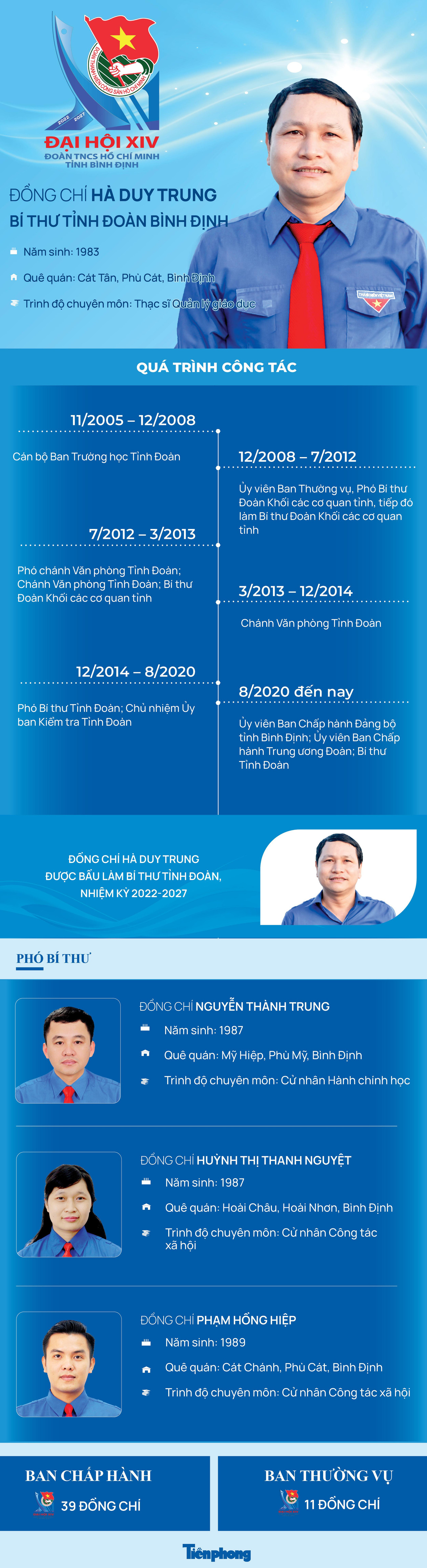 TPO - Chiều 26/9, tại Hội nghị Ban Chấp hành Đoàn TNCS Hồ Chí Minh tỉnh Bình Định lần thứ nhất, anh Hà Duy Trung tiếp tục được bầu giữ chức Bí thư Tỉnh Đoàn Bình Định khóa XIV, nhiệm kỳ 2022 – 2027. Hội nghị cũng bầu anh Nguyễn Thành Trung; anh Phạm Hồng Hiệp và chị Huỳnh Thị Thanh Nguyệt giữ chức Phó Bí thư Tỉnh Đoàn Bình Định.