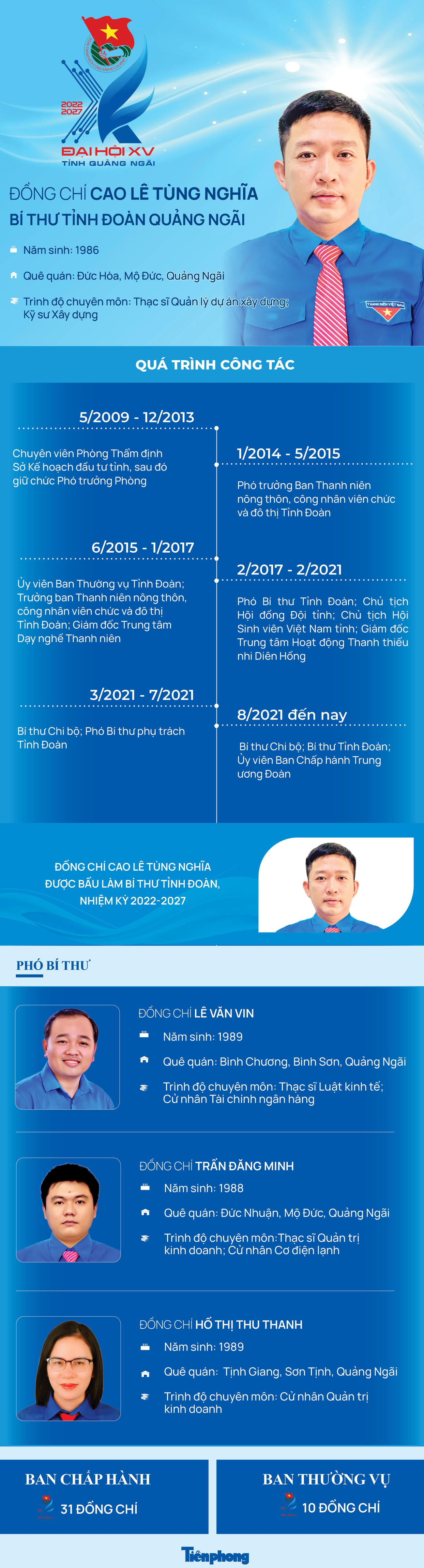 TPO - Anh Cao Lê Tùng Nghĩa tái đắc cử Bí thư Tỉnh Đoàn Quảng Ngãi khóa XV, nhiệm kỳ 2022 – 2027. Ba Phó Bí thư Tỉnh Đoàn khóa mới là anh Lê Văn Vin, anh Trần Đăng Minh và chị Hồ Thị Thu Thanh.