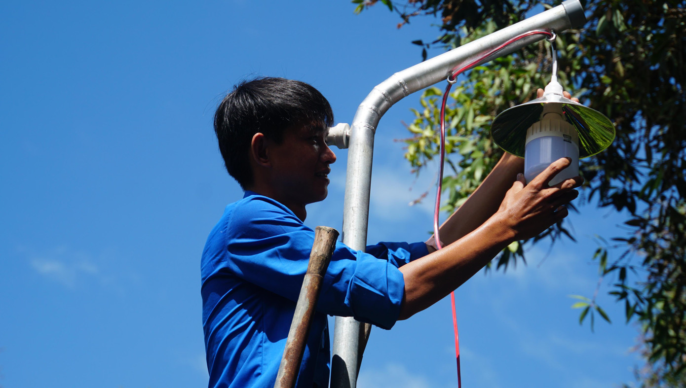 | ĐVTN xã Mỹ Bình lắp đèn chiếu sáng. - Ảnh: Hòa Hội |