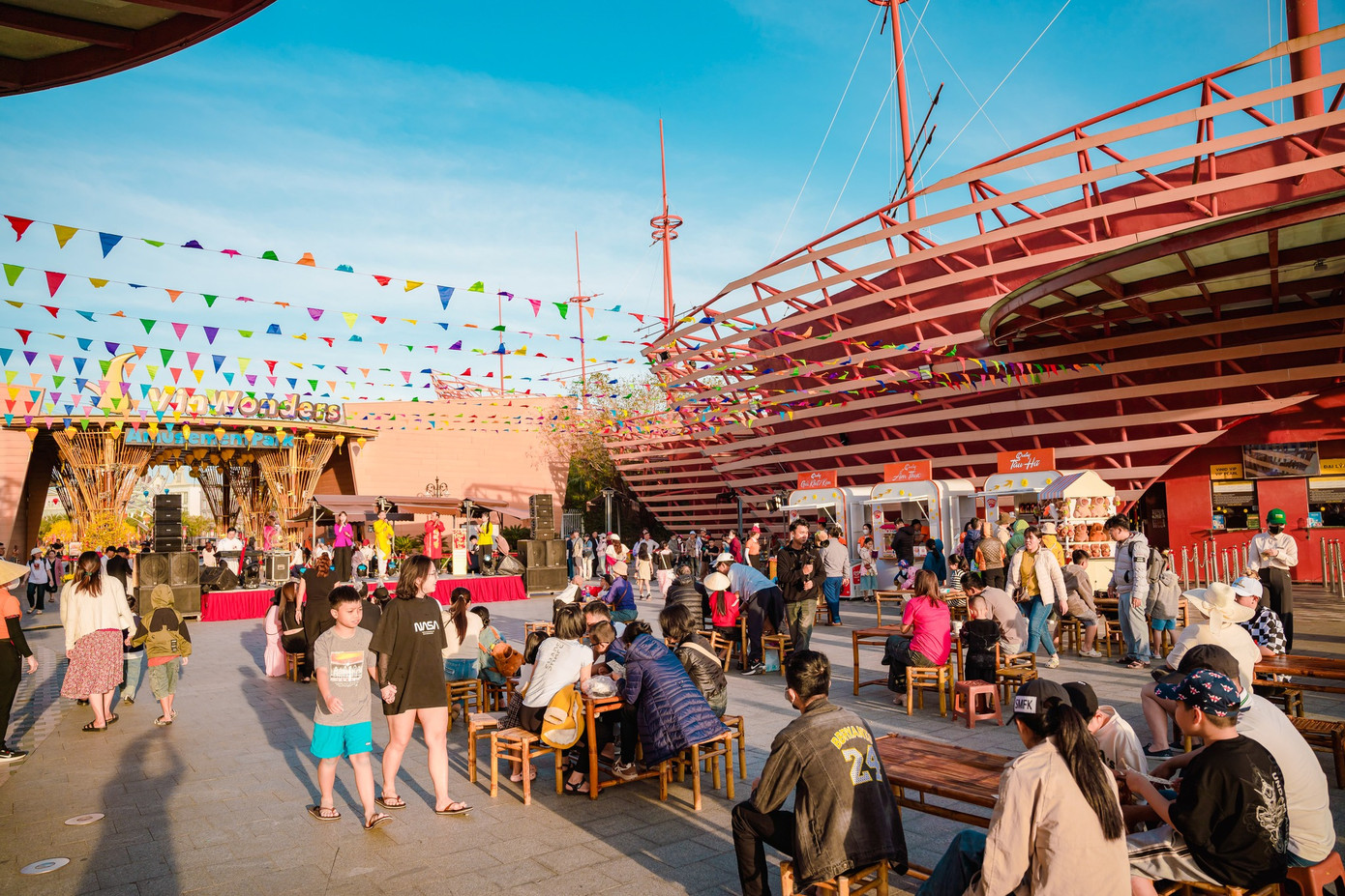 Trong khi đó, tại Vinhomes Royal Island (Vũ Yên, Hải Phòng), cư dân “đảo tỷ phú” cùng hàng ngàn du khách lần đầu tiên được đón Tết Nguyên đán theo phong cách cung đình. Được đặt ngay tại Quảng trường Hoàng gia - Royal Square, hơn 100 gian hàng chợ Xuân không chỉ mang tới sản vật 3 miền mà còn là không gian trải nghiệm Tết xưa độc đáo ngay giữa lòng phố Cảng.