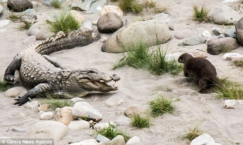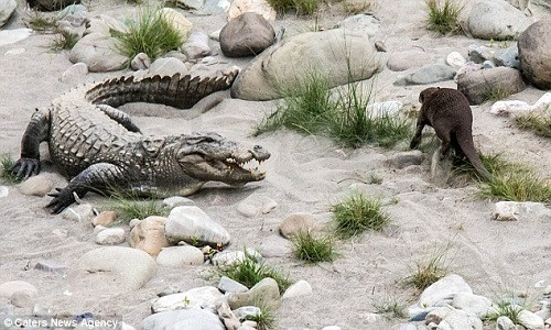 Cuối cùng, rái cá nhảy xuống nước, bỏ mặc cá sấu tức giận gầm rống vì không thể bắt được nó.