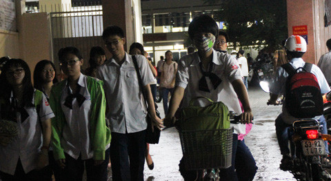 Tại trường THPT Trần Đại Nghĩa (quận 1, TPHCM), sau khi kết thúc buổi học chínhkhóa vào 5h chiều, nhiều phụ huynh vội vàng chở con đến trường để kịplớp học thêm vào buổi tối.