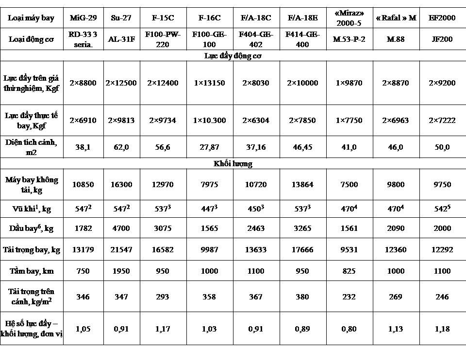 Đối với thông số Lực đẩy – Trọng lượng “thrust-to-weight”, đây cũng là một vấn đề cần phải nghiên cứu cụ thể, trong điều kiện thực tế. Tiêu chí đánh giá Lực đẩy – Trọng lượng thường không đúng theo thực tế sử dụng. Phương thức đánh giá thông thường là lấy thông số lực kéo max của phản lực từ các bảng thông số kỹ thuật, chia cho tải trọng cất cánh của máy bay, cũng lấy từ bảng các thông số tính năng kỹ chiến thuật. Do đó, chúng ta sẽ gặp trên quyển sách đã nêu là: Su 27 Hệ số lực đẩy – trọng lượng là 1,2…...